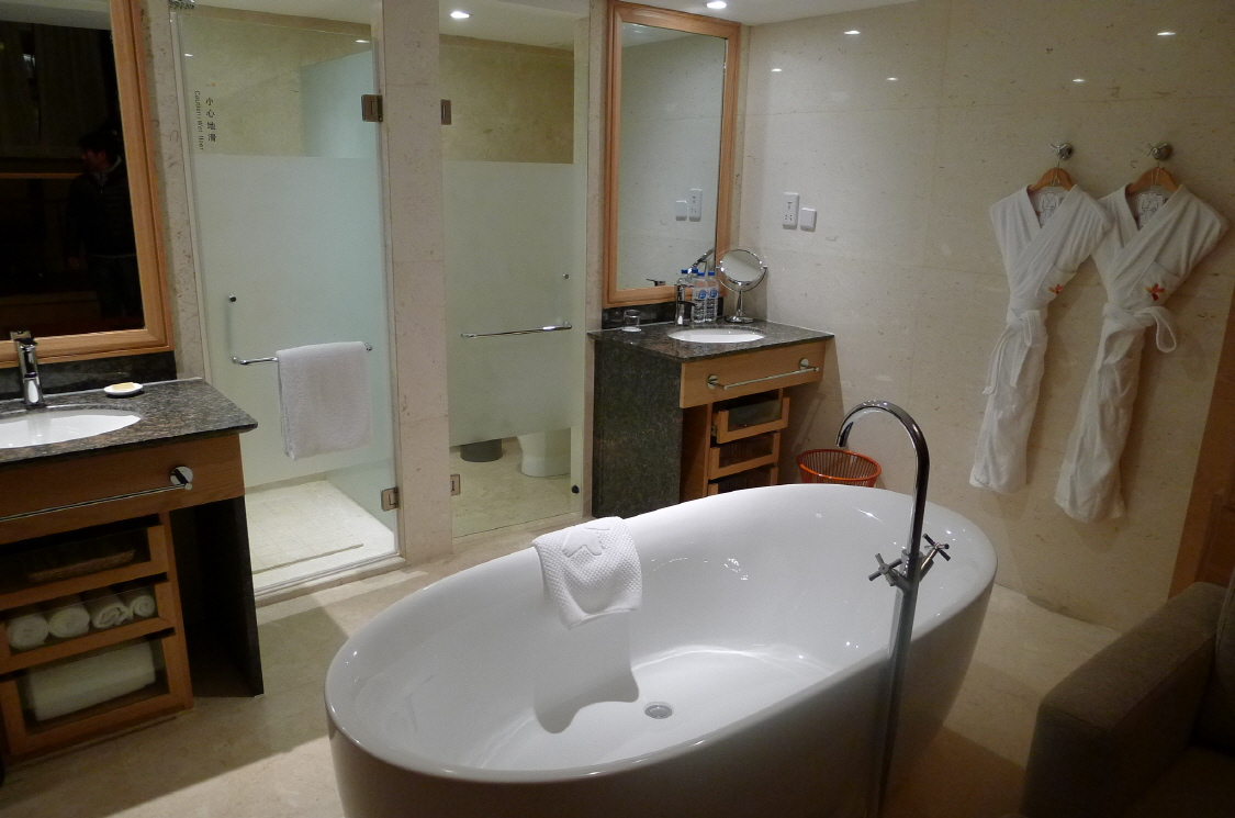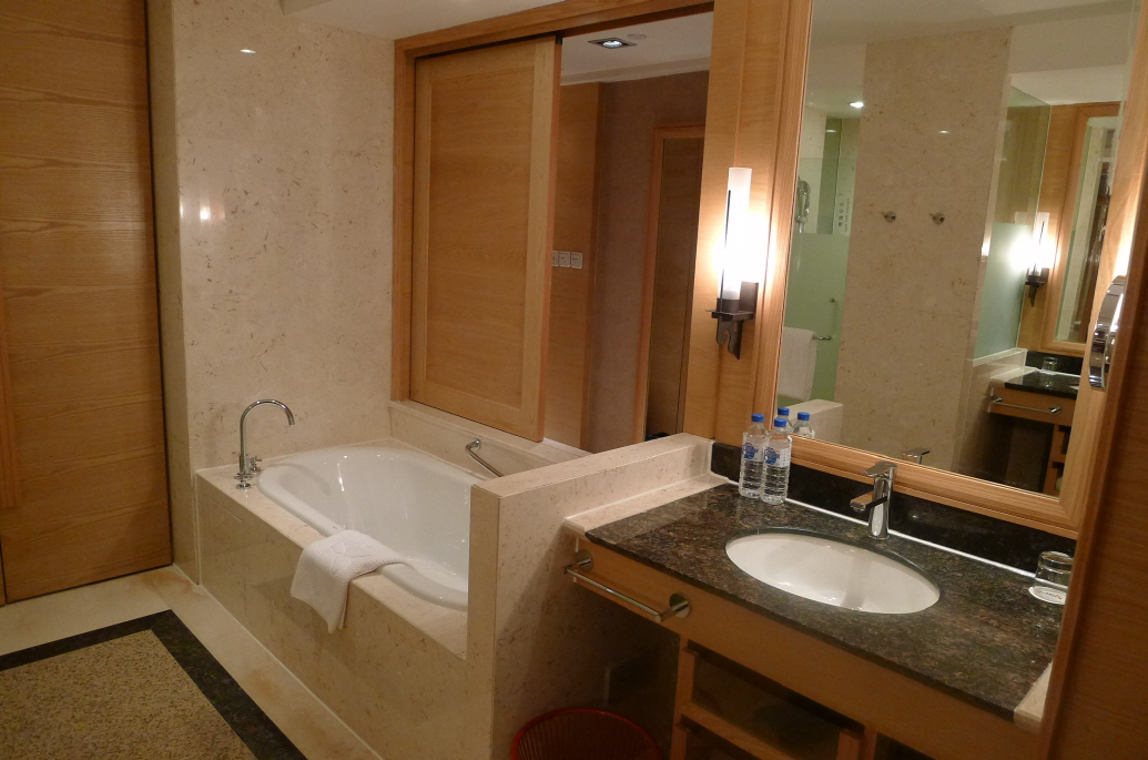 디럭스 클럽룸. 욕실은 샤워 부스와 욕조가 분리되어 있습니다. 두개의 유리문중 왼쪽은 샤워